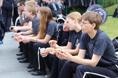 Mit vier Bussen ging es zur Zwischenstation zum Gut Lenninghausen in Drüpplingsen mit einer Besichtigung und Verkostung bei der Gutsbrennerei Bimberg. Trotz der heißen Außentemperaturen ließ es sich hier bei halbwegs gekühltem Krombacher und dem obligatorischem Wurstbrötchen recht gut im Schatten der Gutsgebäude aushalten.