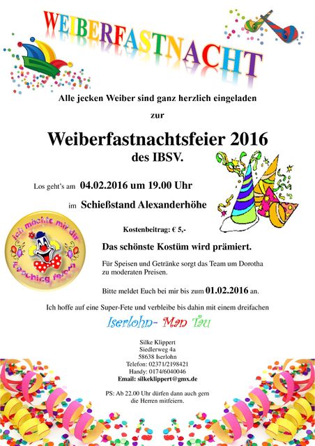 Auch die zweite Weiberfastnachtsfeier des IBSV kann als voller Erfolg gewertet werden. Bei einer leichten Steigerung der Teilnehmerinnenzahl haben am Donnerstagabend über 30 "Jecke Weiber" bis in die Nacht ausgelassen im IBSV-Schießstand auf der Alexanderhöhe gefeiert, getanzt, gelacht, geschunkelt und gesungen. Die Party wurde wieder von Silke Klippert organisiert und vorbereitet. Die Versorgung der "Närrinnen" mit Speis und Trank lag in den bewährten Händen von Dorota Hegemann und ihrem Team, sie spendierte auch die passende Musik. DJ Günter sorgte so für die richtige Karnevalsstimmung und heizte den närrischen IBSV-erinnen ordentlich ein.