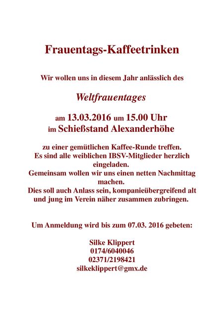 Zum ersten Mal in der Geschichte des IBSV trafen sich 30 weibliche Mitglieder im Schießstand Alexanderhöhe anlässlich des Weltfrauentages zu einer kleinen Kaffeerunde.