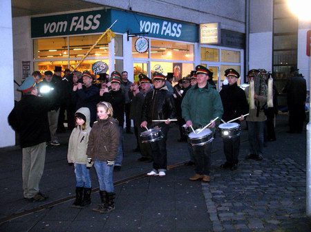 Bei der "Nordsee" gab es nicht nur traditionell die Heringskette für den Strohkerl, sondern auch Häppchen für die Marschteilnehmer. Da Fisch bekanntlich schwimmen muß kam das dazugehörige Getränk von der "Engel Apotheke".