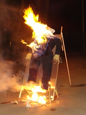 Hier wird vor dem IBSV-Schießstand der Strohkerl, nach einer humorvollen Predigt von Edmund Mix, den Flammen übergeben um stellvertretend für alle für die Sünden zu büßen!