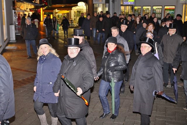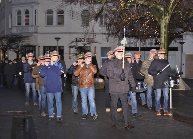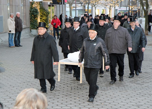 Nicht nur in Köln oder in Düsseldorf findet der Abschied vom Karneval mit einem „Trauermarsch“ durch die Innenstadt statt, sondern auch bei uns in Iserlohn. So marschierten an diesem Aschermittwoch über 60 Mitglieder der 4. IBSV-Kompanie in Schwarz und mit Zylinder bekleidet und vom IBSV-Spielmannszug begleitet von der Innenstadt zur Alexanderhöhe. „Stärkungen“ für den langen Marsch zur Alexanderhöhe gab es beim Startpunkt, der Gaststätte Treff am Neumarkt, an den Zwischenstationen bei Gold-Friedrich an der Laarstraße, der Nordsee und der Engel-Apotheke am alten Rathausplatz sowie bei der Gaststätte Klöneck.