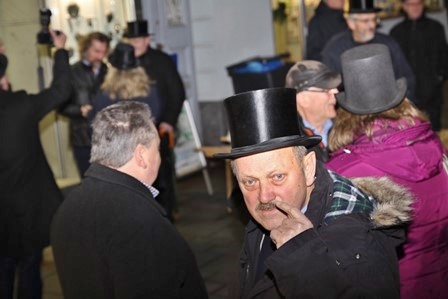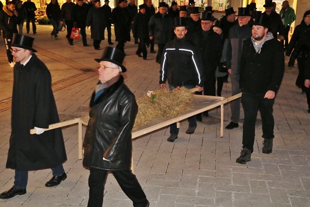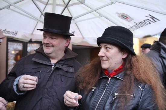 Auch 2017 traf sich die "Trauergemeinde" der 4.Kompanie wieder an der Gaststätte "Treff am Neumarkt", um hier von der Wirtin eine kleine flüssige Stärkung zu erhalten, bevor der Strohkerl durch die Innenstadt zur Alexanderhöhe getragen und begleitet wurde.