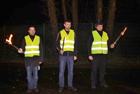 Dann wurden die Fackeln entzündet und es ging weiter zur Endstation, dem IBSV-Schießstand auf der Alexanderhöhe. Dort wurde auf dem Parkplatz nach einer kurzen Trauerrede von "Pastor" Kurt Bergmann, der erfreulicherweise für den erkrankten Edmund Mix eingesprungen ist, der Strohkerl mit einem dreifachen "Er brenne hell!" den Flammen übergeben.