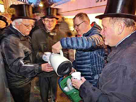 Am Treffpunkt der "Trauergemeinde" gibt es erst einmal für die selbige geistige Getränke zur Stärkung. Dann marschiert der "Trauerzug" mit klingendem Spiel durch die Fußgängerzone um sich an weiteren drei bis vier Stationen zu stärken bis zum Stroblerplatz am IBSV-Schießstand auf der Alexanderhöhe.
